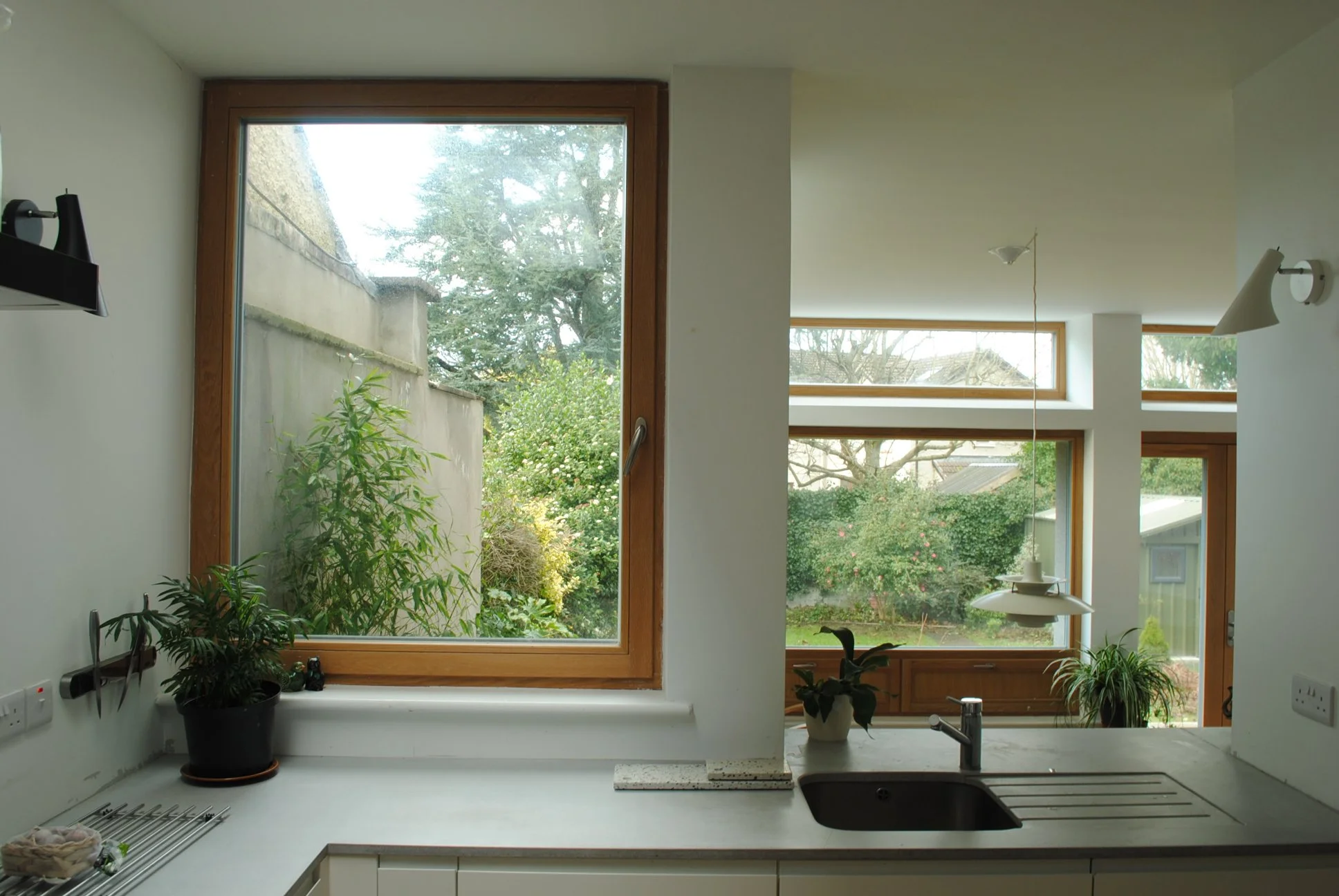The new addition is flat roofed in order to control the overall massing and create a counterpoint to the flat roof of the existing dwelling. The new building is finished in a tinted textured render, chosen to subtly contrast with the existing dwelling in texture and colour.